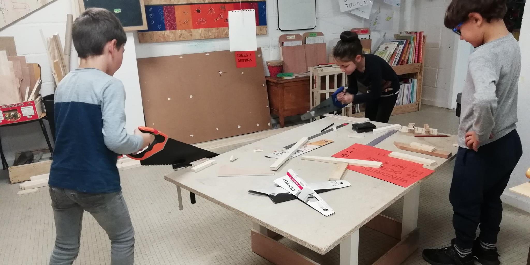 On pousse encore les meubles pour aménager un espace 100% bricolage au sein de l’atelier Par Tout Artiste ! Les participants, enfants et ados, ont pour projet d’imaginer une ville futuriste, en construisant les éléments de celle-ci à partir de bois. C’est donc en sciant, vissant, clouant, peignant, que cette installation folle à vu le jour.