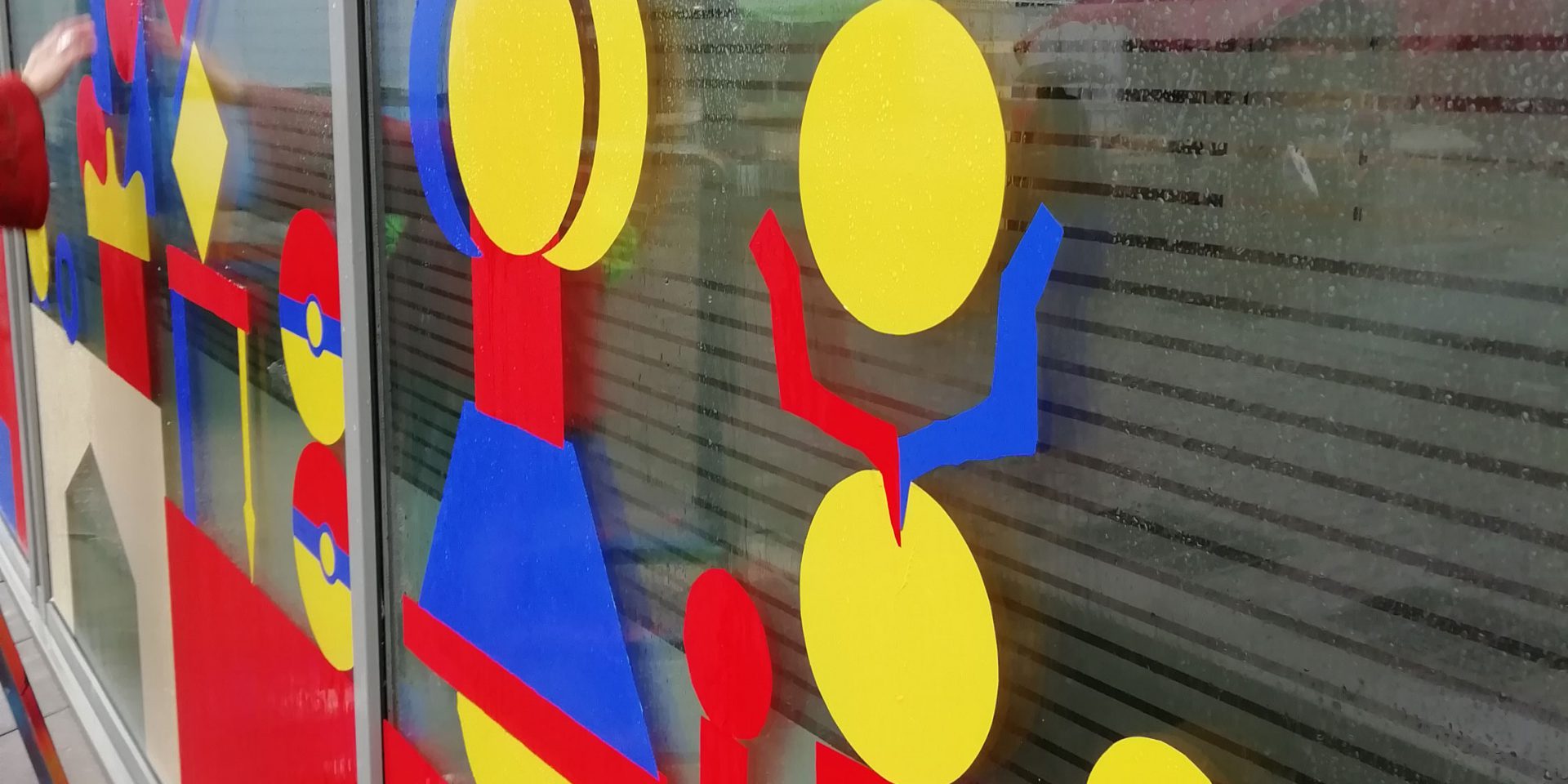 Cette année c’est l’artiste Valérian Henry qui est intervenu sur les vitres de l’ESC Aimé Césaire dans le cadre du projet Patch Color #2 et de la fête Sarah Berhnardt. L’artiste a imaginé et posé la base de la fresque, et s’en est suivi des ateliers auprès d’enfants du Centre Social des Champs Manceaux et de Par Tout Artiste, et d’adultes en formation avec PRISME. Chacun a donc pu apporter sa pierre à l’édifice, en s’imprégnant de l’univers géométrique et coloré de l’artiste.