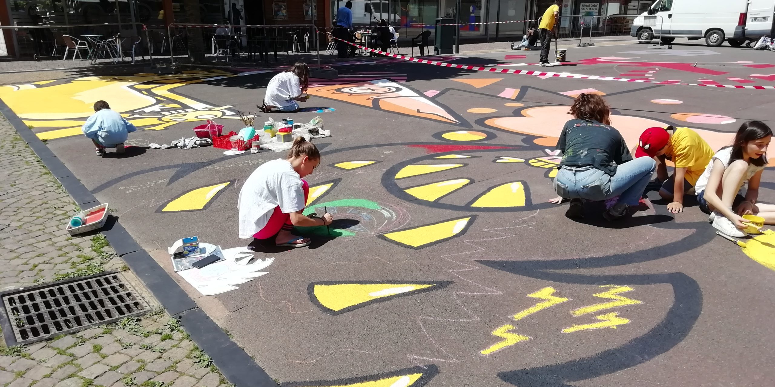 L’idée est donc née d’une fresque géante au sol s’inspirant de l’univers «Flipper». Il nous tenait à coeur que les enfants soient dans le processus créatif avec les artistes. Nous avons ainsi présenté cette idée au collectif La Crèmerie qui a été enthousiasmé par cette proposition. Cette fresque reprendra des dessins d’enfants après des temps de discussion et brainstorming avec les artistes. Il y ont ajouté leur univers tout en essayant d’y intégrer des parcours ludique et jeu au sol.
