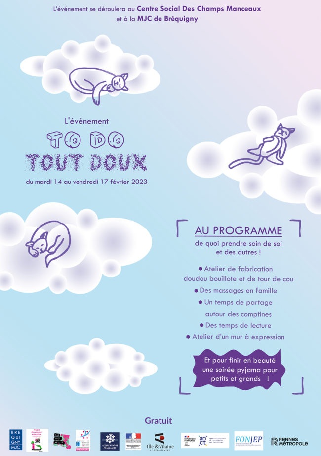 Après cette vague de grand froid, venez prendre soin de vous et des autres à l’événement « To Do Tout Doux » qui se déroulera au Centre Social Des Champs Manceaux et à la MJC de Bréquigny du 14 au 17 février.