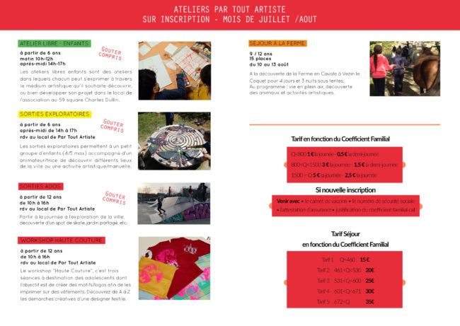 Oyé Oyé, Vous trouverez le programme de l’été 2021 de Par Tout Artiste. Pour les ateliers sur inscription, il faudra prendre rdv au 06 13 66 63 65. Pour les nouveaux inscrits, il faudra se munir : du carnet de vaccins, du coefficient familial, le numéro de sécurité sociale, l’attestation d’assurance.