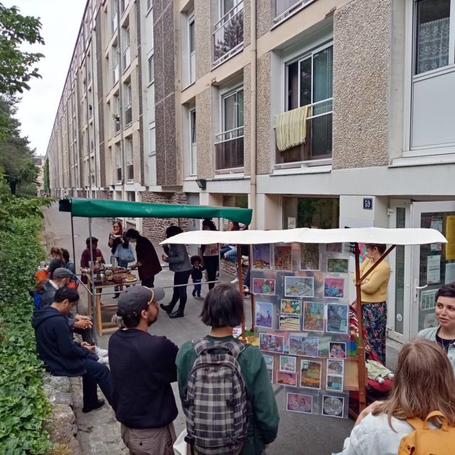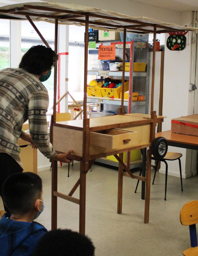 Hier, l’artiste-menuisier Gaspard Husson est venu rendre visite à l’atelier ados. Et il n’est pas venu les mains vides ! Il a construit un stand mobile nommé L’auvent qui permettra à Par Tout Artiste de montrer des expositions d’artistes en extérieur !