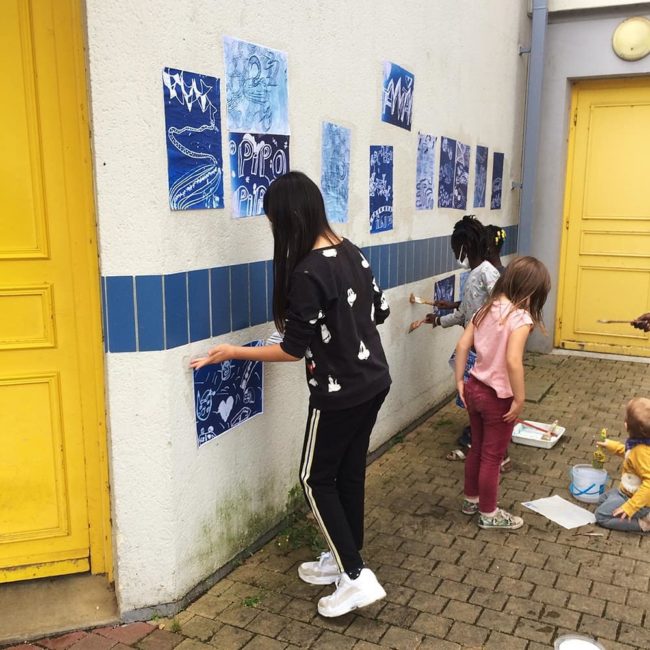 Clap de fin pour l’atelier Cyanotype avec le graffeur @joepopi et Sarah de l’équipe de Par Tout Artiste. Les posters des enfants de la Mjc de Suède sont à découvrir au Square de Copenhague, sur le mur de la Crèche Louise Bodin.